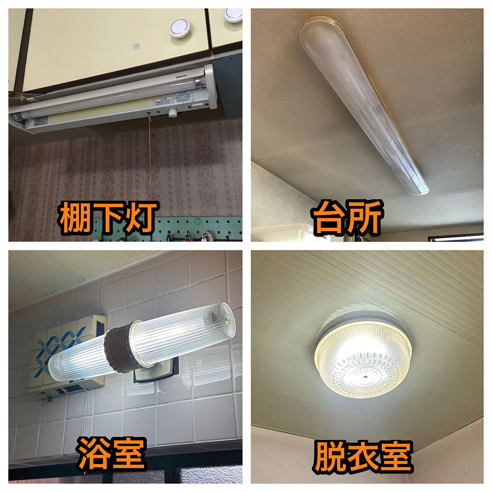 特に水まわり、脱衣洗面所、浴室、そして台所の天井照明や棚下灯などは、直付照明(引掛シーリング型ではない照明)蛍光灯が残っているケースが多いです。電気工事が必要な照明です。この機会に、照明器具をみなおしましょう!